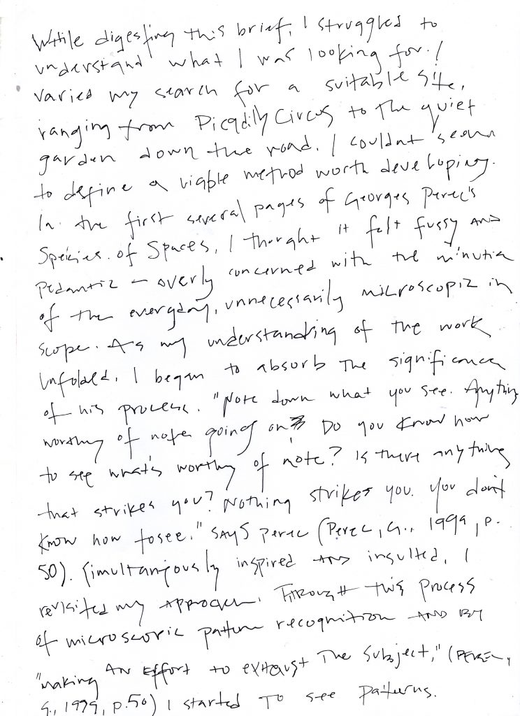 While digesting this brief, I struggled to understand what I was looking for. I varied my search for a suitable site, ranging from Picadilly Circus to the quiet garden down the road. I couldn’t seem to define a viable method worth developing. In the first several pages of Georges Perec’s, Speicies of Spaces, I thought it felt fussy and pedantic – overly concerned with the minutia of the everyday, unnecessarily microscopic in scope. As my understanding of the work unfolded, I began to absorb the significance of his process. “Note down what you can see. Anything worthy of note going on. Do you know how to see what’s worthy of note? Is there anything that strikes you? Nothing Strikes you. You don’t know how to see.” says Perec (Perec, G.,1999, p. 50). Simultaneously inspired and insulted, I revisited my approach. Through this process of microscopic pattern recognition and by “making an effort to exhaust the subject,” (Perec, G., 1999, p. 50) I started to see the patterns.