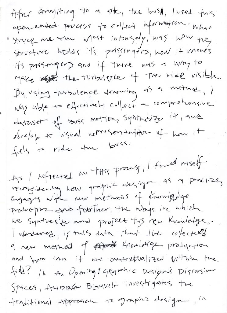 After commiting to a site, the bus, I used this open-ended process to collect information. What struck me most intensely, was how the structure holds it’s passengers, how it moves it’s passengers and if there was a way to make the turbulence of the ride visible. By using turbulence drawing as a method, I was able to effectively collect a comprehensive dataset of bus motion, synthesize it, and develop a visual representation of how it feels to ride the bus.