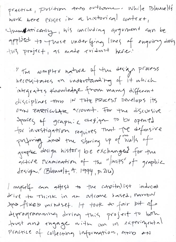 As I reflected on this process, I found myself reconsidering how graphic design, as a practice, engages with new methods of knowledge production and further, the ways in which we sythesize and project this new knowledge. I wondered, is this data that I’ve collected a new method of knowledge production and how can it be contextualized within the field? In An Opening: Graphic Design’s Discursive Spaces, Andrew Blauvelt investigates the traditional approach to graphic design, in practice, position and outcome. While Blauvelt’s work here exists in a historical context, thematically, his concluding argument can be applied to these underlying lines of enquiry during this project, as made evident here:
