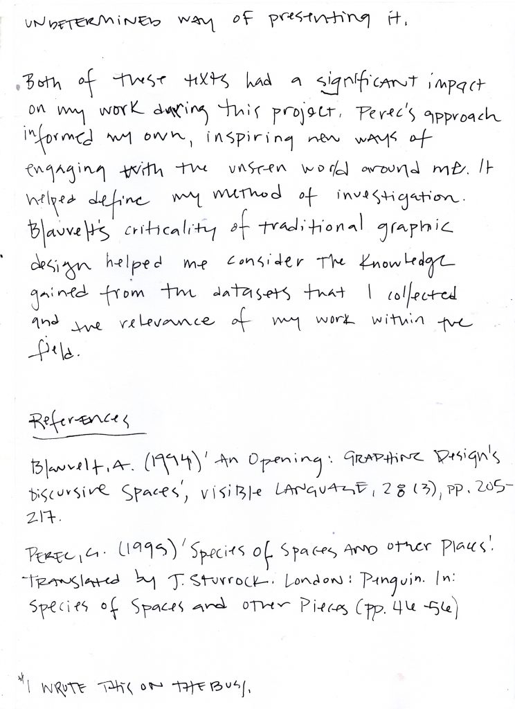 Both of these texts had a significant impact on my work during this project. Perec’s approach informed my own, inspiring new ways of engaging with the unseen world around me. It helped define my method of investigation. Blauvelt’s criticality of traditional graphic design helped me consider the knowledge gained from the datasets that I collected and the relevance of my work within the field.